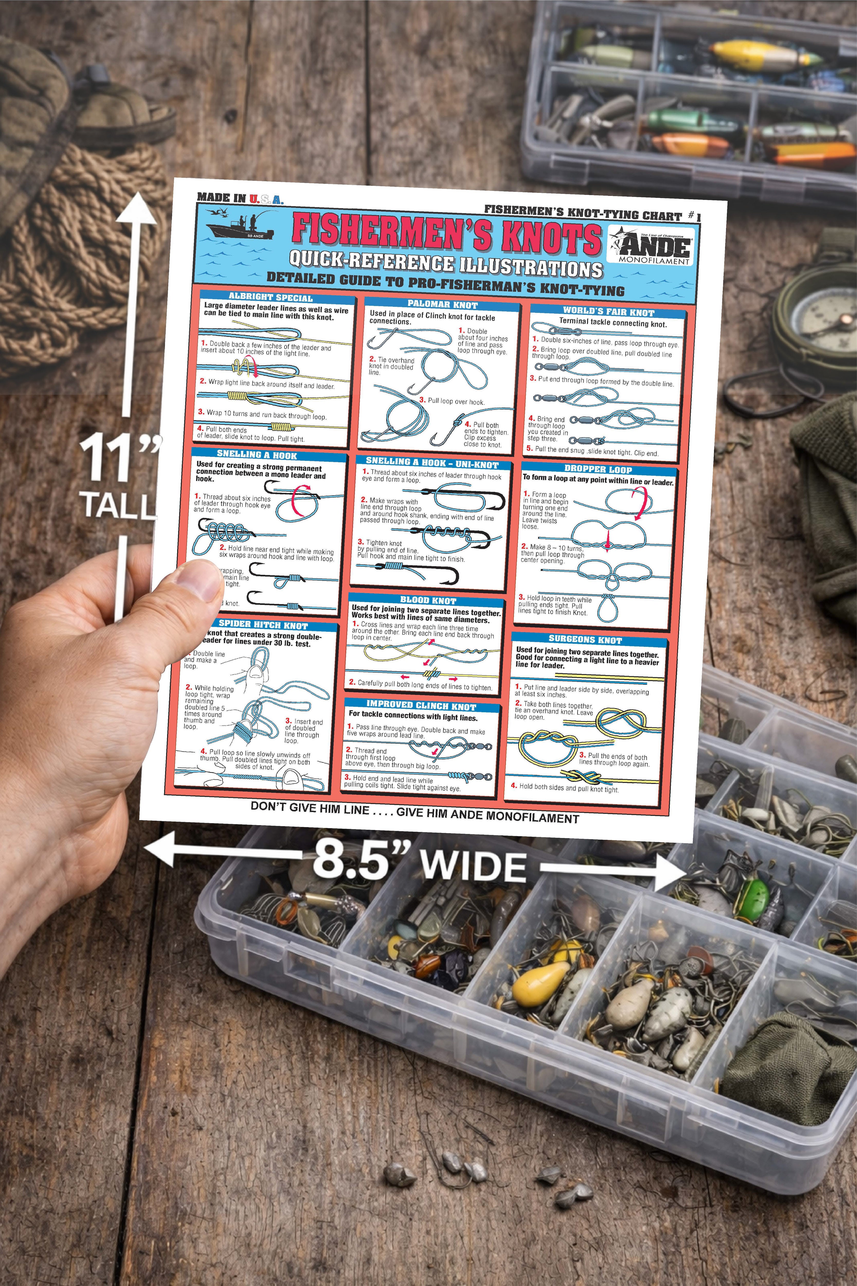 Our Fishermen's Knot Tying Chart Set covers how to techniques and materials needed for offshore wind on leaders and knot tying. Knot Tying Charts #1-8 contain comprehensive step-by-step guides with full color, detailed illustrations on how to tie professional and recreational level knots. This set includes our saltwater and freshwater knot tying charts as well, which is perfect for any level of fishing enthusiast.