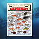 Our Pan-Fish Chart covers various fish species that make great meal after catching. This Identification Chart series contains 18 different freshwater and 18 different saltwater species of fish; such as Northern Porgy, Permit, Trippletail, Snapper, Pompano, Coney Grouper, Mangrove Snapper, Black Sea Bass, Hog Snapper, Bluefish, Scup Porgy, Flounder, Mutton Snapper, Fluke (Summer Flounder), Haddock, and many more. Each chart contains vital information such as the animal's general adult size, weight, food quality, latin naming, and coloring. This chart also contains amazing tried and true fisherman's recipes that are sure to please. A must have in your tackle box if you enjoy cooking a fresh catch.